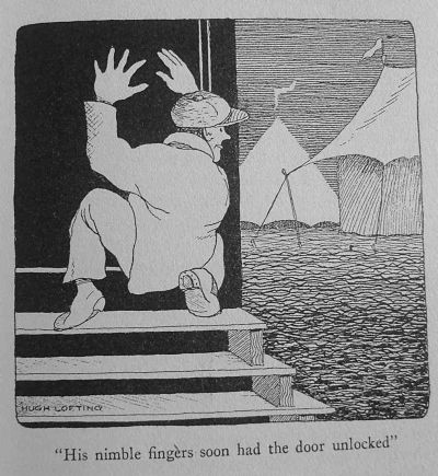 The Doctor spent the night in prison. But in the meantime the lion had taken refuge in the cellar of a bakery and neither the baker nor anybody else dared go down to him. Everybody in the house was scared to go to bed. Messages were sent to the circus to send someone to take the lion away. But the wily Matthew Mugg, although he knew the lion was easily handled by those who knew him, told the people that the Doctor was only one who dared go near him and they better hurry up and let him out of jail if they wanted the lion taken away.
