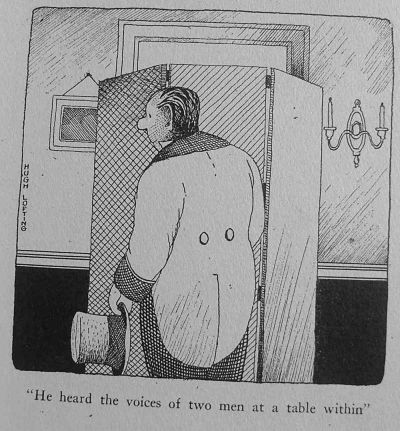 "He heard the voices of two men at a table