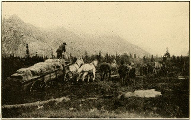 Our plan was to start from the end of the Grand Trunk Pacific Railway west of Edmonton, and have our outfit transported by wagon or pack pony through the Yellowhead Pass alongside the railway construction. We could not find out for certain if a wagon road had been completed through the pass, and we therefore took a collapsible boat, that could be rolled up and packed on a horse's back.