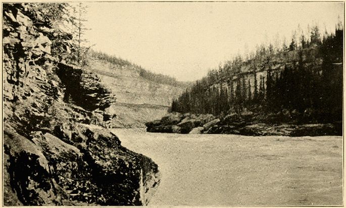 Pausing only long enough to exchange bulletins with our friends on deck, we hastened on down. We had a great desire to beat them to the Landing, and we thought we might do it by floating all night, for they would have to tie up during the hours of darkness. Five minutes later we were out on the muddy bosom of the big river, the same turbid, hurrying Athabasca that we had camped beside months before under the shadow of Roche Miette, but greatly increased in size.