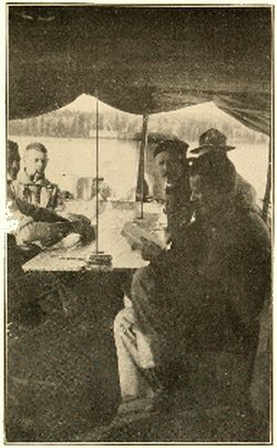 They had arrived only a few minutes before us. There was a little group of log shacks on top of the bank, but the tenants had flown, and we had the Point to ourselves. We camped in company on the grass. It threatened to rain, and we put our two canvases together to make one long shelter.