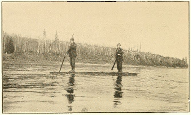 We met a gang of lumbermen building a raft. They were out of tobacco. I was sorry for them, but I had none. We saw an Indian under the farther shore painfully toiling up-stream. We were glad we were going the other way. Finally we overtook two young fellows apparently standing in the middle of the river. A closer investigation showed that they had a tiny raft beneath them. This was Saturday, and they were on their way down to the Landing for a "time." All day long they had been standing on their flimsy craft. They couldn't sit down for fear of getting their Sunday clothes wet.
