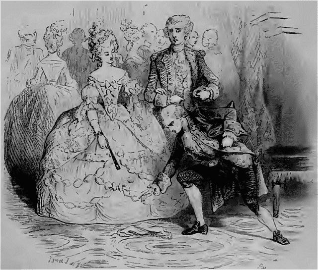 Mademoiselle Guimard ayant laissé tomber son mouchoir, une toile de Hollande ennuagée de matines, un bijou de mouchoir filé par la main des fées, M. le chevalier de Palissandre, vaurien fieffé qui portait la chenille et maniait l'épée comme Fronsac, conçut l'impertinente idée de se baisser pour le ramasser; mais il le fit si gauchement, qu'il effleura de son pied celui de M. le mousquetaire Anspech, qui, pour lors, donnait la main à mademoiselle Guimard la jeune. Le butor!... Bref, on échangea deux regards et on se salua le plus poliment du monde, mais le lendemain on alla se couper la gorge.