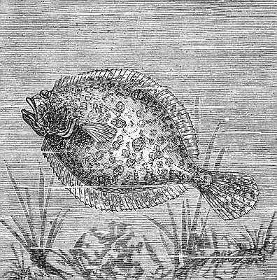 8. The flounder finds safety in being flat. Its head and both eyes are on one side, so that it can lie upon the bottom in shallow water on the other side, with its eyes turned upward. Thus danger can come from one side only, and that is well watched. The English sole is like our flounder;[Pg 227] and the turbot, of the same family, is large and much esteemed for food.