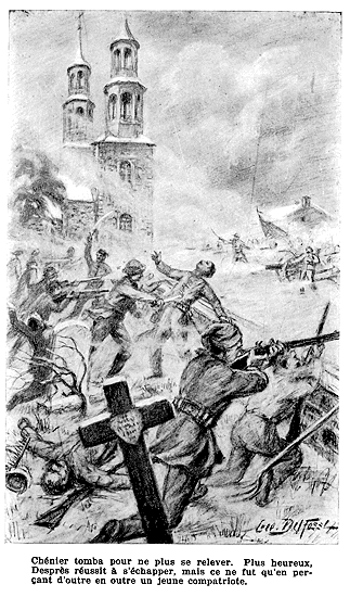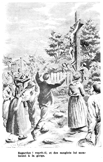 Quand nous arrivâmes, le prêtre était en prière. Des voisins, hommes et femmes, garçons et filles, agenouillés sur le plancher nu, suivaient ses mouvements avec curiosité. Nous fîmes comme les autres. Nous avions, par respect pour le bon Dieu, laissé le fusil et le hibou sur le perron de pierre, tout près de la porte. Sur une petite table recouverte d'un drap blanc, on avait placé un crucifix de plâtre et deux pâles bougies. Le crucifix portait de larges taches rouges sur le front, sur le côté, sur les mains et les pieds, et les bougies répandaient dans la pièce basse une lueur mélancolique.