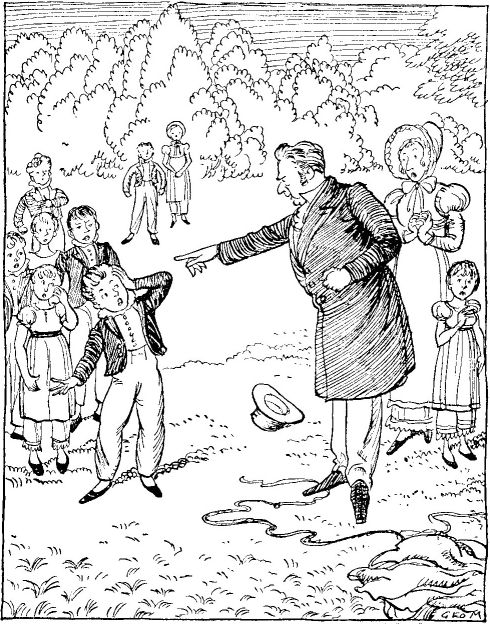 In response to the cries of the frightened children Miss Smith came running out, followed by John the footman, who lifted Thomas in his arms and bore him into the house, where it was discovered that his discreditable prank had resulted in a broken leg. It was not until Dr. Affable had been sent for and put the limb into splints that Thomas was sent home in Mr. Birdikin's carriage with a note to the curate begging that he should not be further punished for his delinquency and stating that Mr. Birdikin would himself defray the cost of the requisite medical attendance in view of Mr. Guff's straitened circumstances.