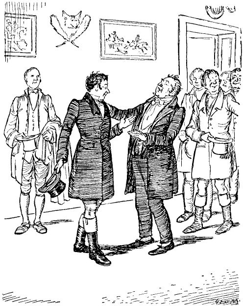 Arrived at the entrance to the Earl's mansion, Mr. and Mrs. Birdikin alighted, and, followed by the children, entered the stately precincts, there to be regaled with such refreshment as was fitting for the occasion. Mr. Birdikin was gratified to observe the children instantly seized upon by the Viscount Firebolt, the Honourable John, and the Lady Mary, for he felt that this exhibition of intimacy between his own offspring and that of his host could not but impress those of his neighbours who were witnesses of it. The Earl himself, a handsome and manly figure in his scarlet coat, came forward to greet him, and requested him, in humorous fashion, to take something to keep out the draught. Mr. Birdikin was about to engage him in a serious conversation about the Corn Laws, which were then exercising the minds of landowners, but he turned aside to greet others of his guests, and what was Mr. Birdikin's surprise to see that these were none other than Mr. Clott, the ironmonger, Mrs. Clott, and her niece, Miss Smith.