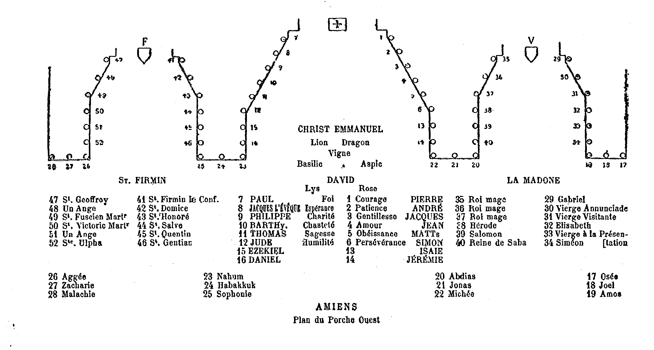Au milieu est la statue du Christ qui est non au sens figuré, mais au sens propre, la pierre angulaire de l'édifice. A sa gauche (c'est-à-dire à droite pour nous qui en regardant le porche faisons face au Christ, mais nous emploierons les mots gauche et droite par rapport à la statue du Christ) six apôtres: près de lui Pierre, puis s'éloignant de lui, Jacques le Majeur, Jean, Mathieu, Simon. A sa droite Paul, puis Jacques l'évêque, Philippe, Barthélemy, Thomas et Jude 14. A la suite des apôtres sont les quatre grands prophètes. Après Simon, Isaïe et Jérémie; après Jude, Ezéchiel et Daniel; puis, sur les trumeaux de la façade occidentale tout entière viennent les douze prophètes mineurs; trois sur chacun des quatre trumeaux, et, en commençant par le trumeau qui se trouve le plus à gauche: Osée, Jaël, Amos, Michée, Jonas, Abdias, Nahum, Habakuk, Sophonie, Aggée, Zacharie, Malachie. De sorte que la cathédrale, toujours au sens propre, repose sur le Christ et sur les prophètes qui l'ont prédit ainsi que sur les apôtres qui l'ont proclamé. Les prophètes du Christ et non ceux de Dieu le Père: