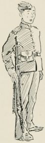 The boys stared furtively round the orderly-room, a little box partitioned off from the disused malt-house that served as drill shed. On the walls were highly-coloured posters, setting forth the various advantages of his Majesty's services, while in the corner a jumble of arms and equipment and a half-opened case of rifles caused them to nudge each other. A huge Sergeant was writing at a table covered with Army forms, drill books, and parade registers, amongst which a couple of cartridges attracted their attention.