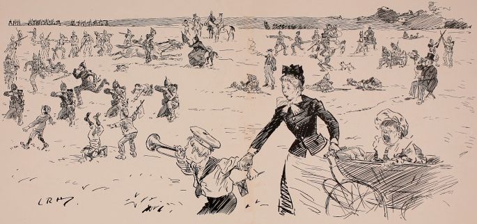 Wednesday.—Something about living in the open that has a very stimulating effect upon one. Made quite an excellent breakfast. The Adjutant gave a most interesting lecture on outpost work before we started; he mentioned several points that I don't mind confessing had slipped my memory. I feel sure, with a little careful instruction, the efficiency of the Volunteer Force would be enormously increased. Must refer to it in the House on earliest opportunity. Did an attack with the Brigade this afternoon; very disappointing. Up to certain stage everything went well, but, as attack developed, got in some way mixed up with the Blankshires, who were, undoubtedly, far out of their proper line. Had slight argument with their C.O. Dear old chap, of course, but absolutely pig-headed. Would not see my point. G.O.C.'s remarks rather uncalled for, under the circumstances. Had to speak to several of the company officers about letting their men get out of hand. The various Adjutants seem to regard the matter with an amount of levity which I don't altogether approve of. Mess very uproarious to-night; most unnecessarily so in my opinion. Heard afterwards one of the subalterns had given a lecture on "Tactics, as he understood them."