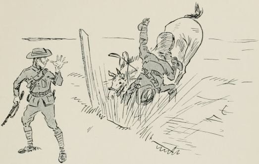 "Any of you men know which is the way to Muddiford? No?" I wonder which is the N.E. road. I thought it was all bally rot getting maps and compasses, but I wish to goodness I had now. If there was only a gleam of sunshine it would help, but you can't even guess where the sun is through these clouds. Oh, damn that cyclist! Oh, the Adjutant's swearing like old boots? Well, here goes. "Take the turning down the hill, boys, and push ahead as hard as you can." Thank goodness we seem to have got clear of 'em now, and by the powers, here's a villager.