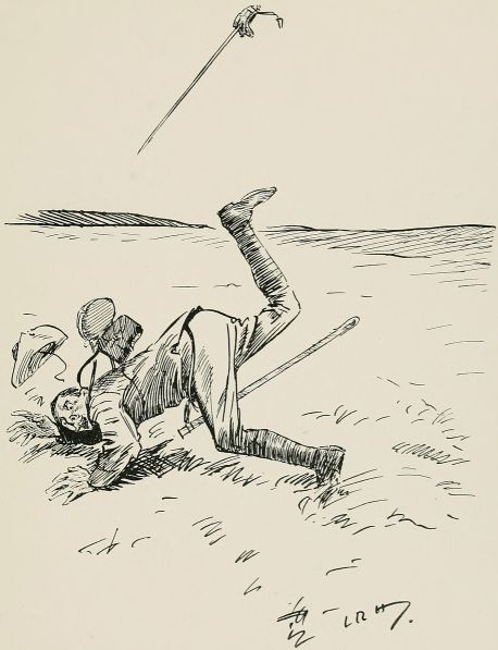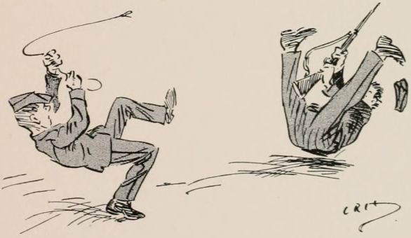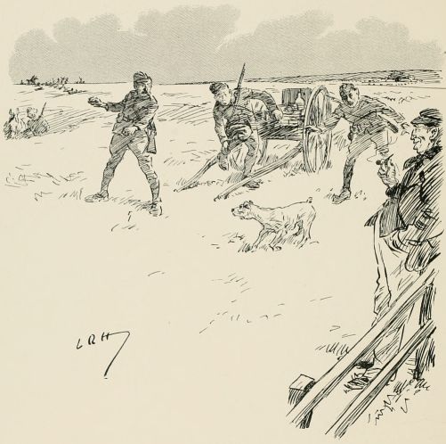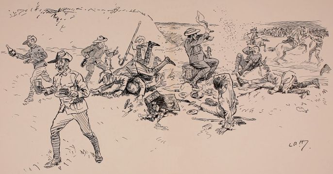 Find we're to act as rearguard to something. Got told off to occupy a bit of a wood right away on the flank. Thank goodness they haven't told me what to do or how long to hold on, or anything, so I shall get out of touch as soon as I can and play off my own bat. Rather good little wood. Men awfully keen on the job. Soon after we occupied position, spotted party of the enemy coming through gap in the hills. Couldn't see them very well on account of the haze, so waited till they got fairly near, and then gave 'em a volley. They sent an orderly over to know what the deuce I meant by firing on the ambulance. Felt rather an ass, but found out afterwards every party they had passed had paid them the same compliment. Soon after scout came in with news of enemy. I wanted to ambush 'em, but some silly fool fired without orders, so it became a regular attack. Put three companies out of action before we retired, but cut it rather too fine, and a few of my chaps got collared. Found the rest of the rearguard had cleared before. Some of 'em mistook us for the bally foe, and blazed into us like old boots. Rotted 'em no end when we got up to them. Everything got in the most awful muddle after a bit; no one knew who was which. After the "Cease fire" sounded came across a lot of chaps firing like mad at anybody who came near. Told 'em the "Cease fire" had gone. "'Cease fire' be damned!" said one of them. "We ain't had a look in till now!"