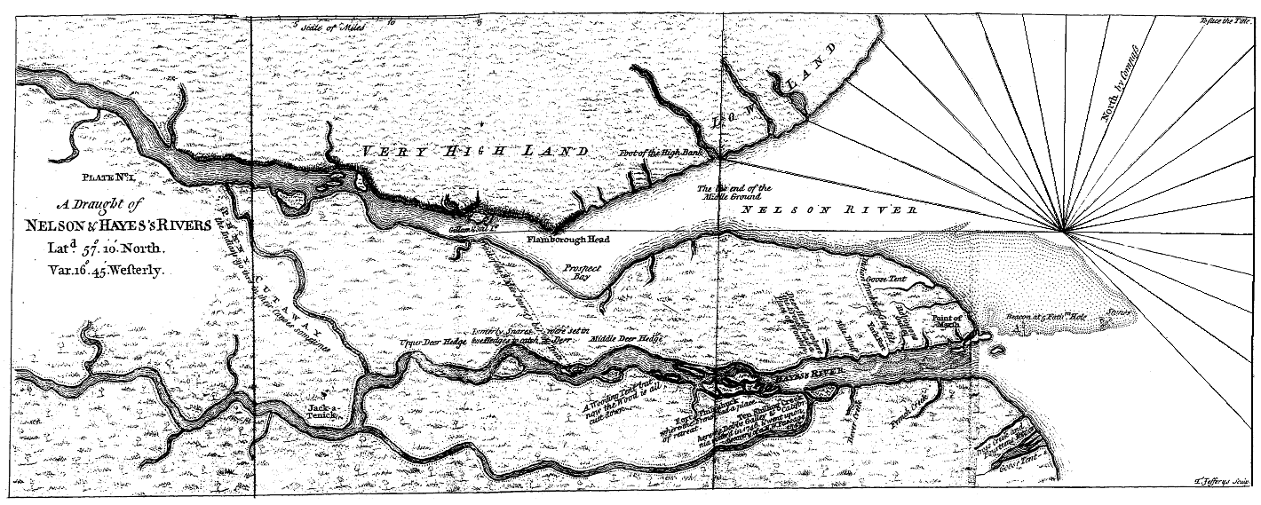 We sailed out of Churchill-river, and soon arrived at York-fort upon Hayes's-river, where the ship was to deliver her cargo and take in another. After her departure for England, I applied myself to the setting up beacons in order to make a chart of the river. The governor, who had resided in the country twenty years, was perfect master of the traditional history of it, even from the first settlement of the English; and being a free and communicative man, he used frequently to entertain us with a regular account of all the principal events and discoveries; to which the linguists seldom failed to add the information they had gathered from the natives. By their means I soon obtained a general knowlege of the country, as well inland as upon the coasts.