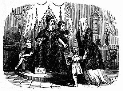 The importunity of the strangers, however, prevailed; and a lady, closely veiled, and muffled in a dark cloak, leading a boy of singular beauty and nobility of presence by the hand, was introduced into the apartment. The widowed queen, in her mourning weeds, was sitting in a chair of state, under a canopy, with her orphan children on either side of her.