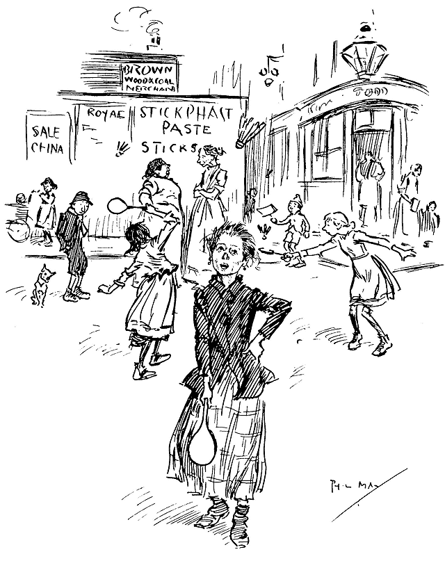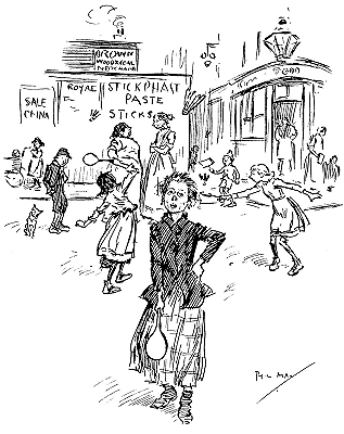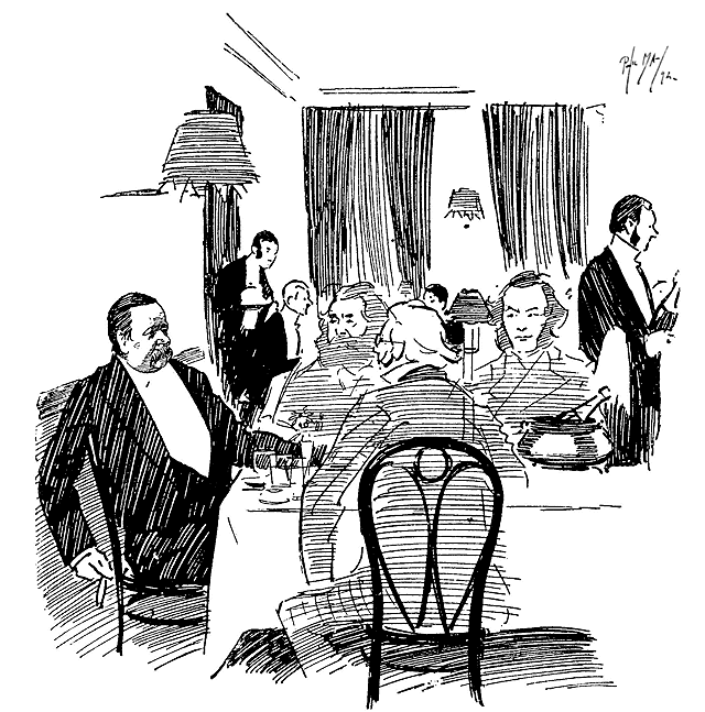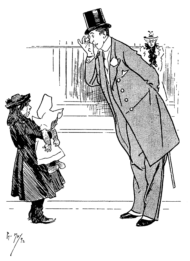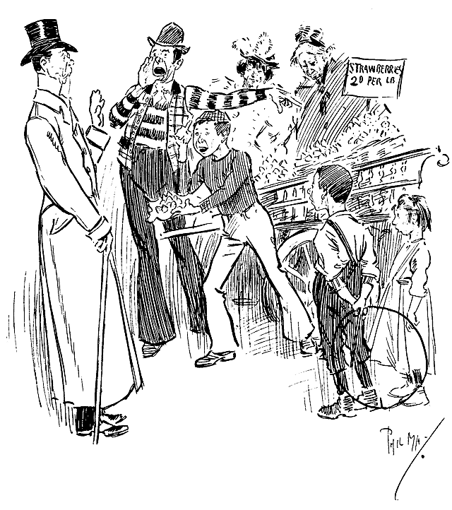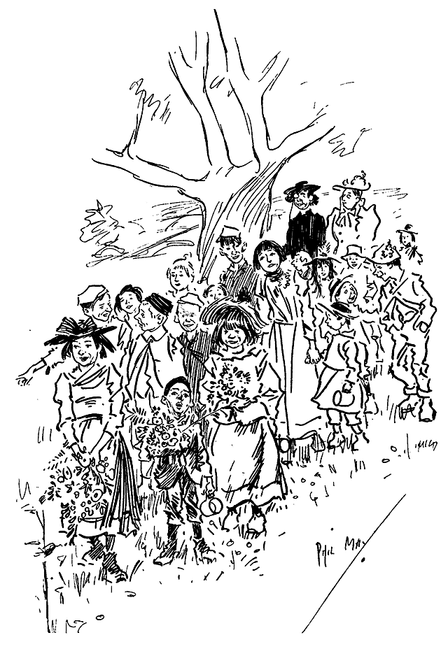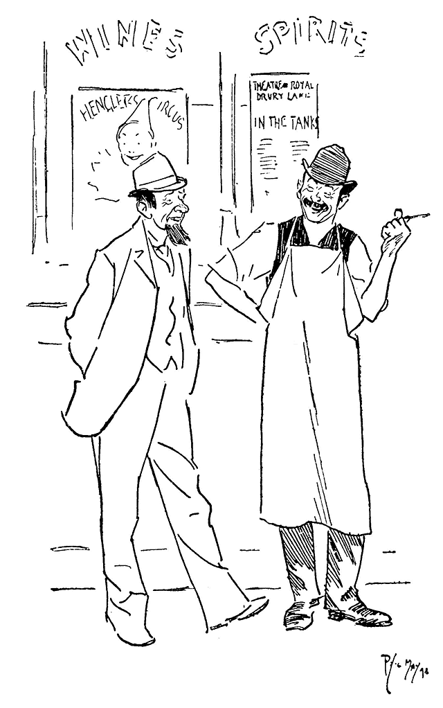 Phil May made his first appearance in Punch with a small drawing on October 14th, 1893. Ten of his drawings were published in its pages in 1894, and thereafter he rarely missed a weekly contribution and was well represented in the Almanacks. At first his humour, dealing as it often did with low life, was considered somewhat out of place in its sedate surroundings, and it was not until February, 1895, that his powers, admirably championed by Mr M. H. Spielmann, were fully recognized, and he was elected to the Punch staff, where he remained a much-valued and very popular member until his death. His initials are carved on the famous table between those of Thackeray and Du Maurier. At his first Punch dinner he was obviously shy and nervous and a little bored. At the end of the evening when nearly everyone had gone, he turned quietly and timidly to Bernard Partridge with his customary suggestion, ‘Let's go to Romano's and have a drink.’ When other engagements prevented him attending the dinner he generally managed to secure a copy of the menu as ‘evidence for Lil’.