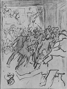 May worked hard in Paris, though he did little or nothing of the conventional work of the schools. He began, it is true, by collecting a large stock of painter's materials, but went very little farther in that direction. His instinct was all for drawing, for the cultivation of beauty and significance in line, and the harder he worked the more he became confirmed in his devotion to the special department wherein his genius lay. Much of his time in Paris was spent in the streets and boulevards and in the cafes, collecting sketches and notes of types, ever improving his native gift of seizing and presenting character.