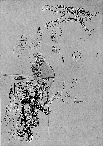 Studies of ‘Drunks’: preliminary sketches for a drawing in punch, August 10th, 1895. By courtesy of the Trustees of the British Museum.