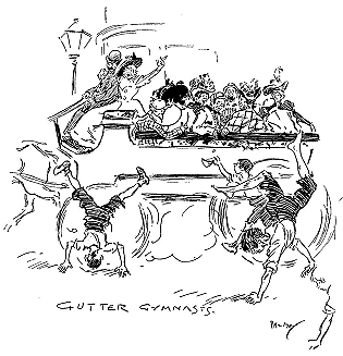 Before the Bulletin contract expired in the autumn of 1888, May had attracted to himself another good friend, anxious to assist in his artistic development. This was a Mr Theodore Fink, a wealthy Australian, who thought that a term of study in Rome and Paris would be for the benefit of May's art, and so urgently pressed his desire to provide the expenses of the experiment that in the end May gratefully accepted the offer. There were many reasons prompting a return to Europe. Money in those days was plentiful in Sydney, but living was extravagant, and May's earnings did not provide much more than the weekly expenses. Though his own health had improved, that of his wife had of late been indifferent, and, with all their Australian success, both were growing a little homesick. Moreover, beyond Rome and Paris there was always the lure of London, the centre of all things in Phil May's world. So with every gratitude to the excellent Mr Fink, who was well content to support the cause of art with a thousand pounds, the Mays set out for Europe in the late autumn of 1888.