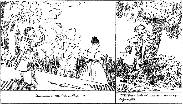 | Mais s'étant mis à la fenêtre, Mr. Vieux-Bois entrevoit l'objet aimé. | Descendu précipitamment dans la rue, Mr. Vieux-Bois n'entrevoit plus l'objet aimé. |