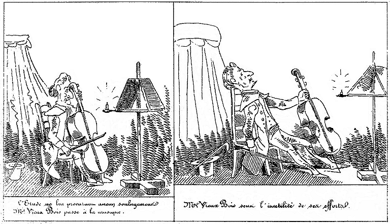 | L'Étude ne lui procure aucun soulagement. Mr. Vieux-Bois passe à la musique. | Mr. Vieux-Bois sent l'inutilité de ses efforts. |