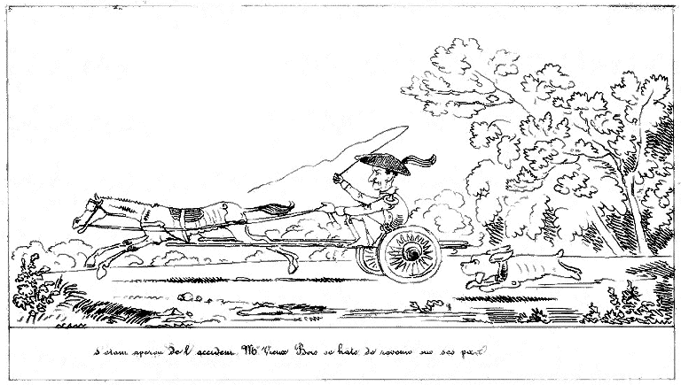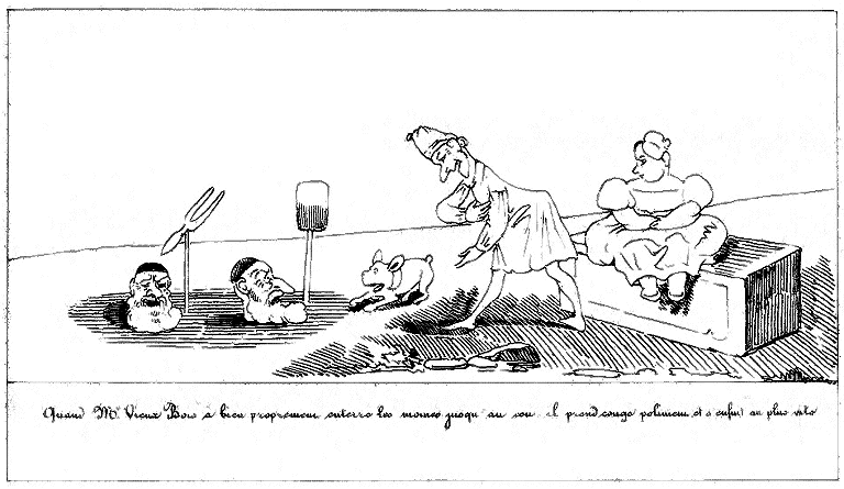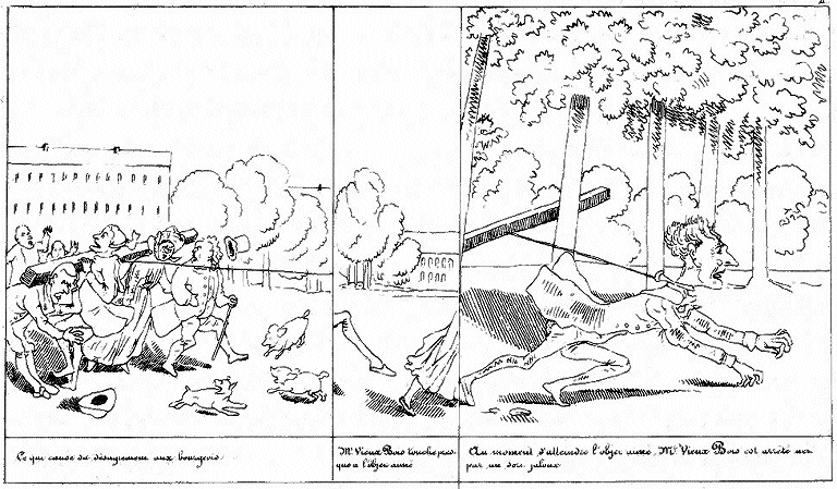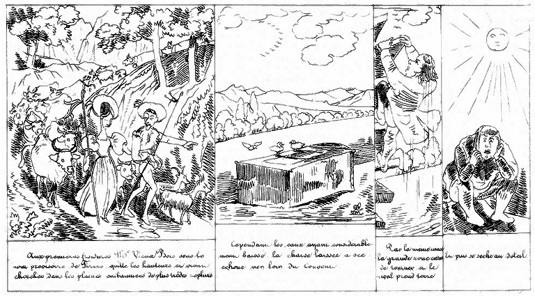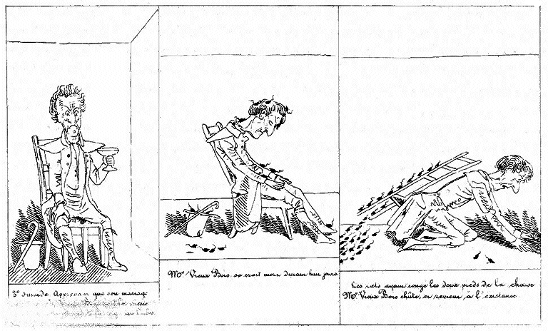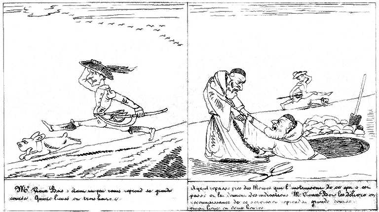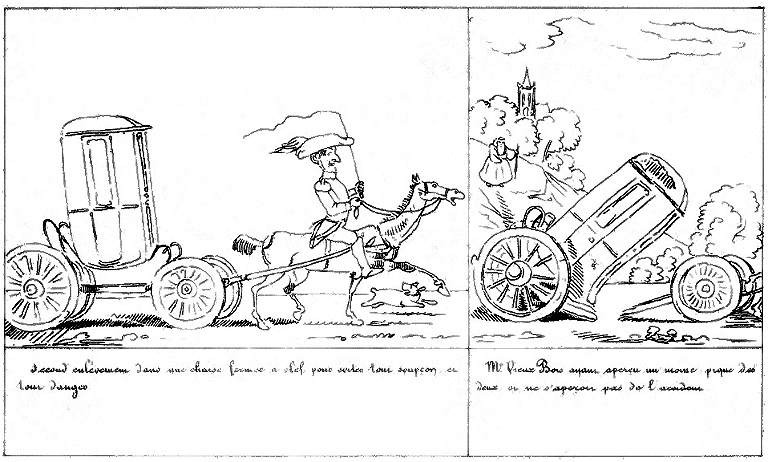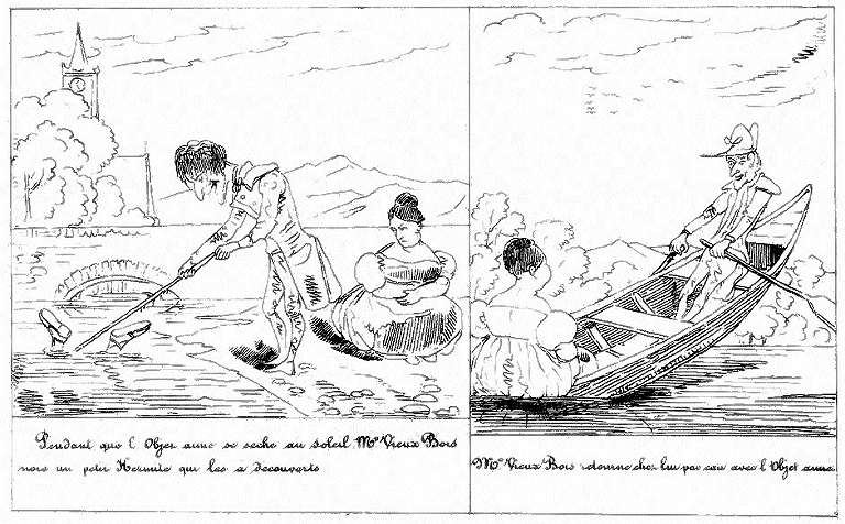 | Aux premières froidures Mr. Vieux-Bois, sous le nom provisoire de Tircis, quitte les hauteurs et vient chercher dans les plaines embaumées de plus tièdes zéphirs. | Cependant les eaux ayant considérablement baissé, la chaise laissée à sec échoue non loin du couvent. | Par la même cause la grande roue cesse de tourner et le rival prend terre. | Et puis se sèche au soleil. |