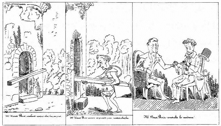 | Mr. Vieux-Bois, ayant eu du dessus, fait la demande aux parents, en présence de l'objet aimé. | Mr. Vieux Bois, accepté, rentre chez lui et s'y livre pendant trois heures à des sauts de joie. |
