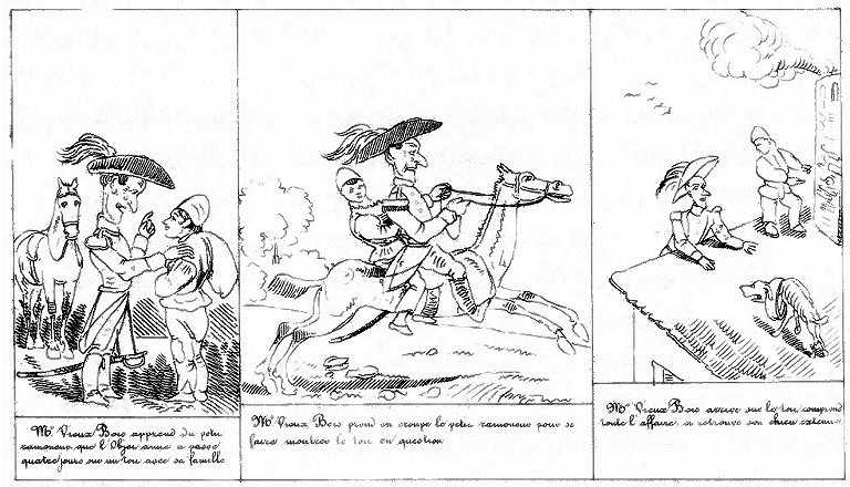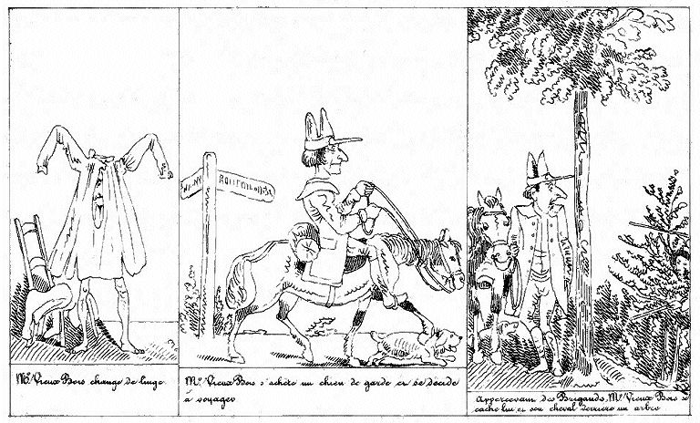 | Mr. Vieux-Bois change de linge. | Mr. Vieux-Bois s'achète un chien de garde et se décide à voyager. | Apercevant des brigands, Mr. Vieux-Bois se cache, lui et son cheval derrière un arbre. |
