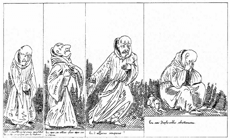 | Deux des moines jugeant au poids et aux écus que c'est un immense trésor font une fosse pour l'enfouir à eux deux. | Quant le trou est assez profond, Mr. Vieux-Bois sort doucement pousse les deux moines dans la fosse, et y rejette promptement la terre. |