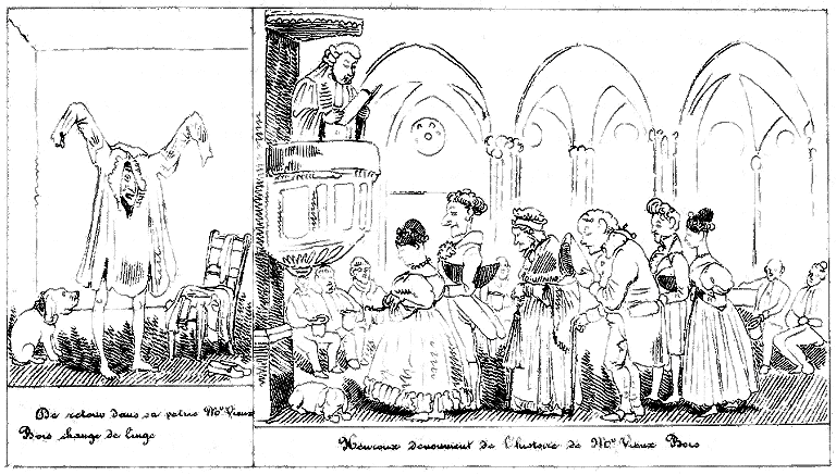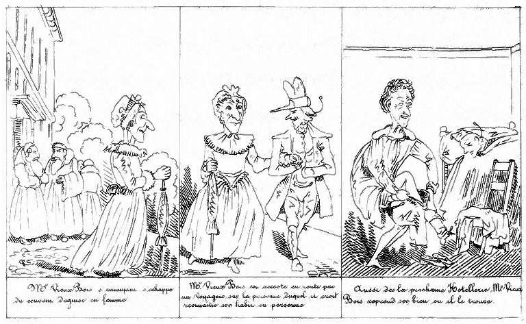 | Mr. Vieux-Bois, s'ennuyant, s'échappe du couvent déguisé en femme. | Mr. Vieux-Bois est accosté en route par un voyageur, sur la personne duquel il croit reconnaître son habit en personne. | Aussi dès la prochaine Hôtellerie, Mr. Vieux-Bois reprend son bien où il le trouve. |