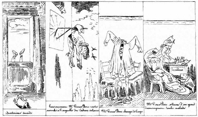 | Quatrième suicide. | Heureusement Mr. Vieux-Bois reste accroché à l'aiguille du cadran solaire. | Mr. Vieux-Bois change de linge. | Mr. Vieux-Bois, atteint d'un grand découragement, tombe malade. |