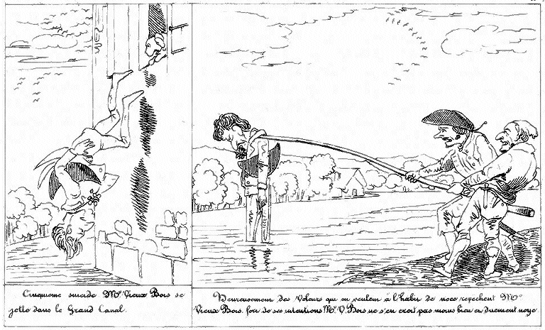 | Cinquième suicide. Mr. Vieux-Bois se jette dans le Grand Canal. | Heureusement des voleurs qui en veulent à l'habit de noce repêchent Mr. Vieux-Bois. Fors de ses intentions Mr. Vieux-Bois ne s'en croit pas moins bien et dûment noyé. |