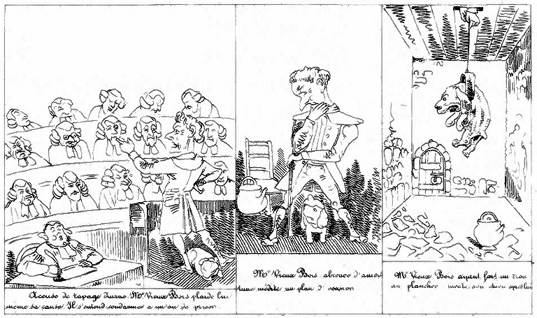 | Au bout de la troisième heure, les voisins accourent irrités. | Mr. Vieux-Bois est mis en prison pour tapage nocturne. | Les parents venant rendre à Mr. Vieux-Bois sa visite apprennent avec étonnement qu'il est en prison. |