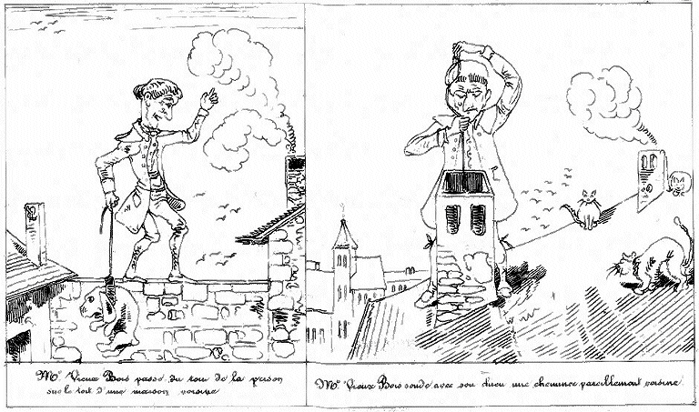 | Tout à coup, Mr. Vieux-Bois a l'ivresse d'apercevoir l'objet aimé à une croisée, de l'autre côté de la rue. | S'étant livré à un saut de joie bien excusable, Mr. Vieux-Bois enfonce la toiture et disparaît. |