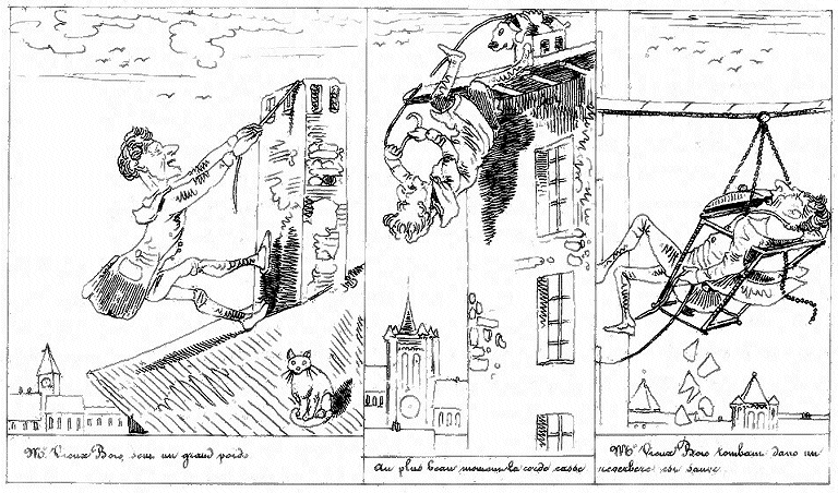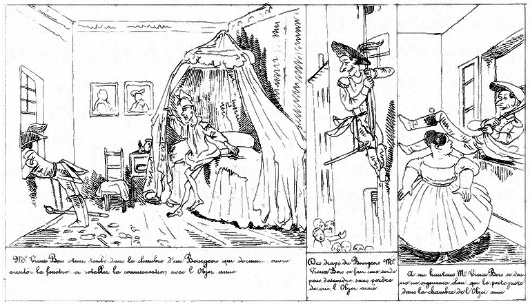| Mr. Vieux-Bois étant tombé dans la chambre d'un Bourgeois qui dormait, ouvre aussitôt la fenêtre pour rétablir la communication avec l'objet aimé. | Des draps du Bourgeois Mr. Vieux-Bois se fait une corde pour descendre sans perdre de vue l'objet aimé. | A mi-hauteur Mr. Vieux-Bois se donne un vigoureux élan, qui le porte juste dans la chambre de l'objet aimé. |