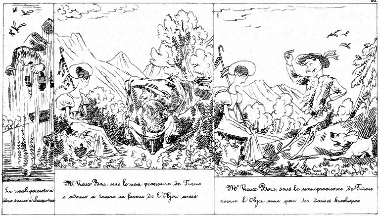 | Cependant le rival continue d'être saucé à chaque tour. | Ayant débarqué sur une rive fleurie, Mr. Vieux-Bois tire de la chaise l'objet aimé. | L'objet aimé étant extrêmement amoindrie, Mr. Vieux-Bois le mène boire le lait à la montagne. |
