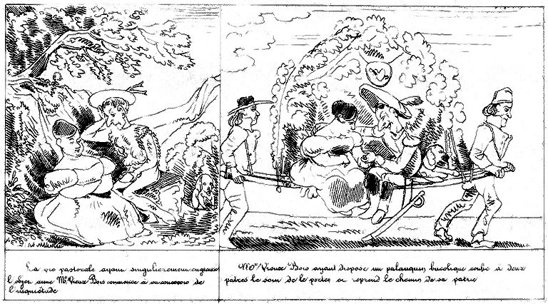 | La vie pastorale ayant singulièrement engraissé l'objet aimé, Mr. Vieux-Bois commence à concevoir de l'inquiétude. | Mr. Vieux-Bois ayant disposé un palanquin bucolique confie à deux pâtres le soin de le porter et reprend le chemin de sa patrie. |