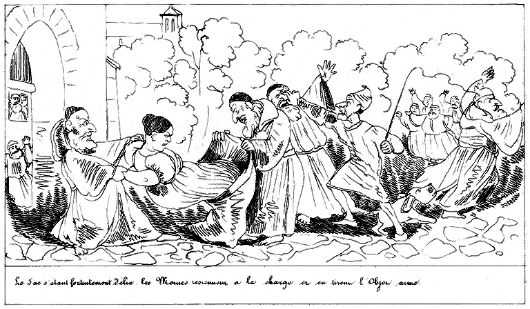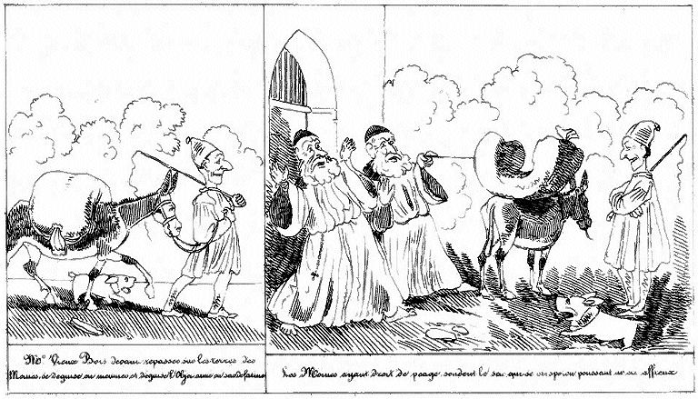 Les moines ayant droit de péage, sondent le sac qui se crispe en poussant un cri affreux. |