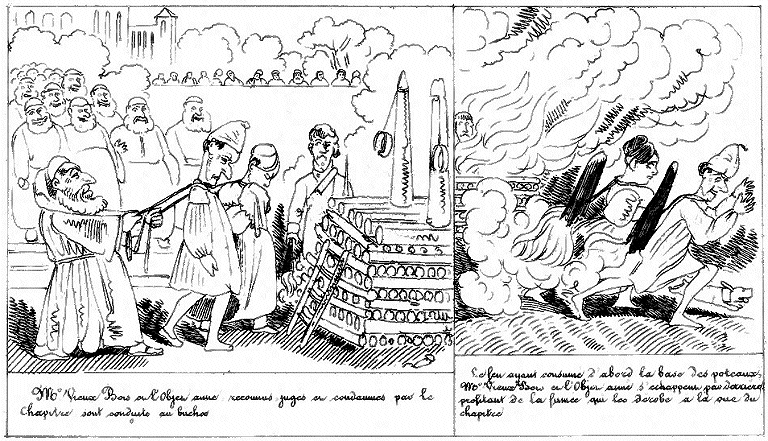 | Mr. Vieux-Bois et l'objet aimé, reconnus, jugés et condamnés par le chapitre, sont conduits au bûcher. | Le feu ayant consumé d'abord la base des poteaux, Mr. Vieux-Bois et l'objet aimé, s'échappent par derrière profitant de la fumée qui les dérobe à la vue du chapitre. |