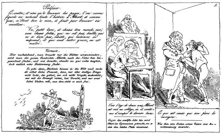 | On cède au voeu d'Albert qui est habillé en étudiant. Pour l'encourager son père lui fait présent d'une badine, et sa mère d'un pantalon à sous-pieds. | En attendant l'ouverture des cours Albert déclame du Hugo. | Ce qui frappe Albert dans son Hugo, ce sont le préfaces, à cause des doctrines. | A partir ce jour, Albert comprend pourquoi les éléments l'ont tant ennuyé; c'est qu'il lui fallait des doctrines! | Les cours académiques s'ouvrent enfin et Albert écoute avec avidité. |