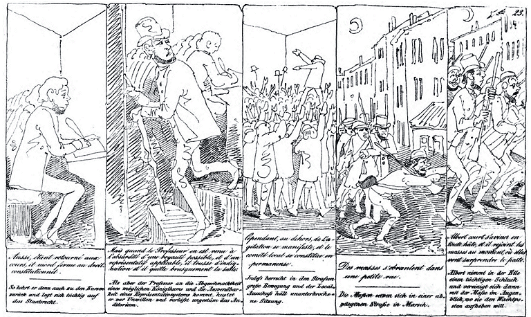 | L'on va faire un tour, et les quatres amis ont bientôt appris des publicistes de l'endroit que le Canton gémit sous le joug sans nom d'une aristocratie échevelée. | Que le gouvernement y est la proie d'hommes personnellement doux et habiles, mais politiquement astucieux et incorrigibles. | Que le peuple y est heureux et libre, mais ne se comprenant pas et n'étant pas compris. | Qu'en conséquence le moment est venu d'apprendre au peuple à se comprendre et à être compris. | Secondé par les amis politiques et par les publicistes de l'endroit, Albert fonde un journal. |