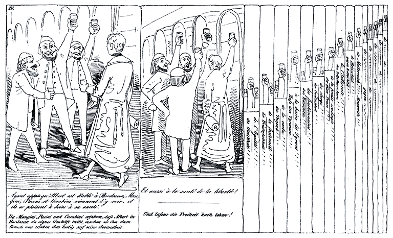| Ayant appris qu'Albert est établi à Bordeaux, Mangini, Pacini et Carabini viennent l'y voir, et ils se plaisent à boire à sa santé. | Et aussi à la santé de la liberté! | de l'Égalité!!!! de la fraternité!!!! de la vérité!!!! de la haine des tyrans!!!! des fonctionnaires!!!! du clergé!!!! de la presse soudoyée!!!! de l'autocratie!!!! de Rothchild!!!! de Metternich!!!! Metternich!!!! de..... etc., de..... etc., de..... etc., de..... etc. |