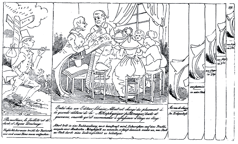 | Par malheur, la faillite est déclarée; et Jaques déménage. | Entré chez un Editeur libraire, Albert est chargé du placement de la grande édition de la Métaphysique pittoresque, texte et gravures, en sorte qu'il recommence à assassiner d'étage en étage. | Au rez-de-chaussée, au premier, au 2ème, au 3ème, au 4ème. |