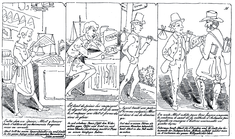 | Entré chez un épicier, Albert y trouve toute l'édition de ses harmonies orageuses mise en cornets. | Et tant de poésie inspirant le dégoût du poivre et de la cannelle, il méprise son état et forme des rêves de gloire. | Ayant traité son patron d'homme vulgaire, Albert est dans le cas de déménager. | En route, Albert achète pour trois francs cinquante centimes, le secret de la méthode d'Aubuisson par laquelle on enseigne l'histoire universelle en quatre leçons. |