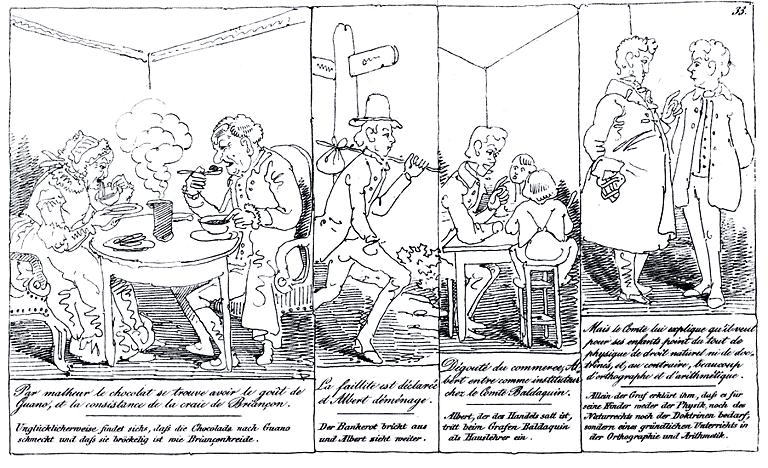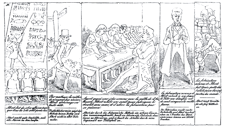 | Par malheur le chocolat se trouve avoir le goût de Guano, et la consistance de la craie de Briançon. | La faillite est déclarée et Albert déménage. | Dégoûté du commerce, Albert entre comme instituteur chez le Comte Baldaquin. | Mais le Comte lui explique qu'il veut pour ses enfants point du tout de physique de droit naturel ni de doctrine, et, au contraire, beaucoup d'orthographe et d'arithmétique. |