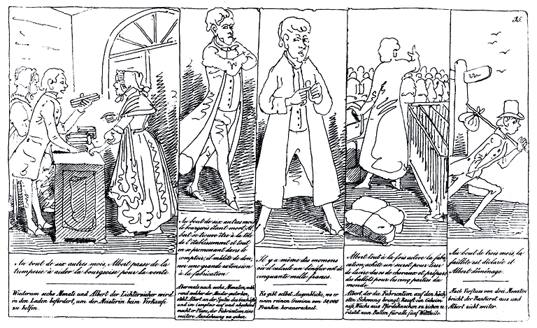 | Le 50e Nº attaque les pouvoirs, persifle les fonctionnaire, et raille les sous-officiers. Tous le caporaux s'abonnent. | Le 50e Nº vaut à Albert des témoignages qui lui rappellent bien vivement la maison paternelle. | Néanmoins Albert trouve l'état bon; et la Suisse un vrai pays de ribote pour les publicistes, en sorte qu'il ne déjeune plus que d'huîtres et de côtelettes payées comptant. | Le 60e Nº attaque avec violence les puissances étrangères. Tous les réfugiés s'abonnent. | Le 70e Nº déplore la mauvaise organisation du travail, et il s'apitoie sur le sort d'un peuple vertueux, qui est livré sans garantie à l'exploitation d'une minorité de capitalistes avides. |