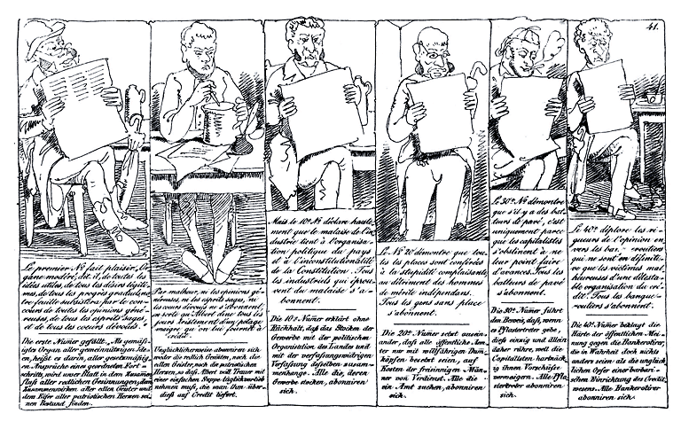 | Le premier Nº fait plaisir. Organe modéré, dit-il, de toutes les idées utiles, de tous les désirs légitimes, de tous les progrès graduels, notre feuille subsistera par le concours de toutes les opinions généreuses, de tous les esprits sages, et de tous le coeurs dévoués. | Par malheur, ni les opinions généreuses, ni les esprits sages, ni les coeurs dévoués ne s'abonnent, en sorte qu'Albert dîne tous les jours tristement d'un potage maigre qu'on lui fournit à crédit. | Mais le 10e Nº déclare hautement que le malaise de l'industrie tient à l'organisation politique du pays et à l'inconstitutionnalité de la Constitution. Tous les industriels qui éprouve du malaise s'abonnent. | Le Nº 20 démontre que toutes les places sont conférées à la stupidité complaisante, au détriment des hommes de mérite indépendants. Tous les gens sans place s'abonnent. | Le 30e Nº démontre que s'il y a des batteurs de pavé, c'est uniquement parce que les capitalistes s'obstinent à ne leur point faire d'avances. Tous les batteurs de pavé s'abonnent. | Le 40e déplore les rigueurs de l'opinion envers les banque-routiers qui ne sont en définitive que les victimes malheureuses d'une détestable organisation de crédit. Tous les banque-routiers s'abonnent. |