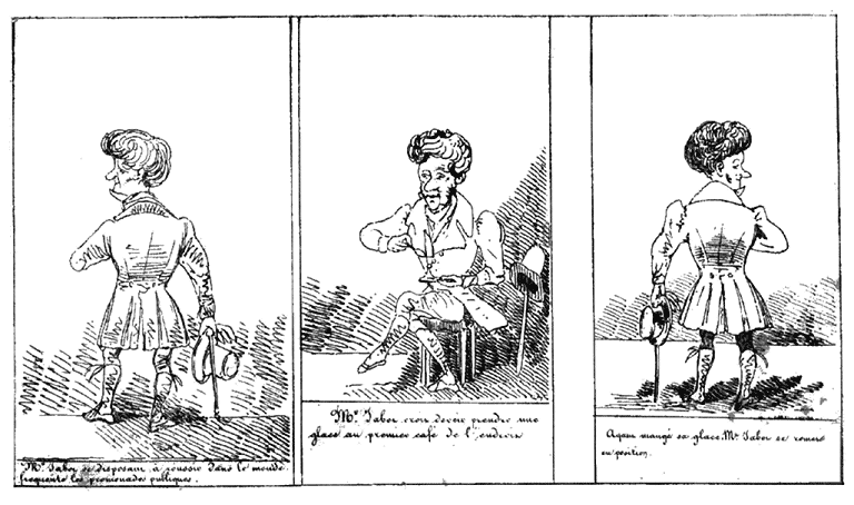 | Monsieur Jabot se disposant à réussir dans le monde, fréquente les promenades publiques. | Mr. Jabot croit devoir prendre une glace au premier café de l'endroit. | Après avoir mangé sa glace, Mr. Jabot se remet en position. |
