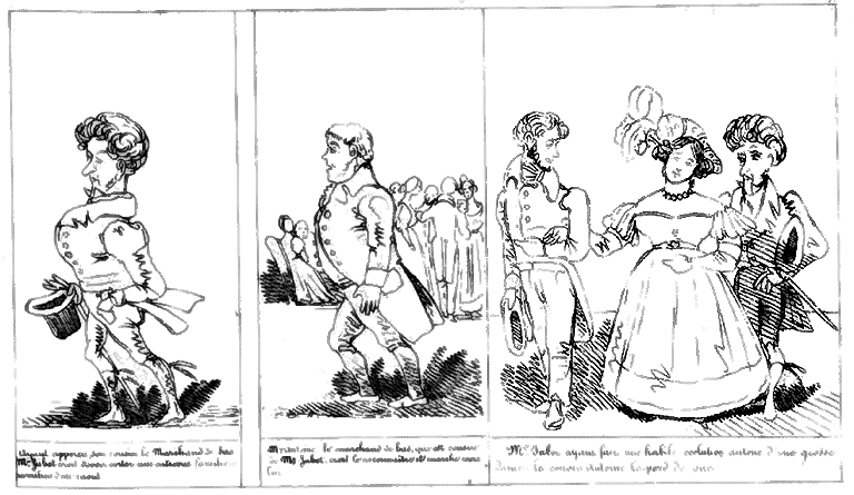| Beau moment! Mr. Jabot fait faire à Milady un tour de salle. | Mr. Jabot croit devoir marquer à Milady une préférance délicate. Un lampion s'éteint et fume. | Aussitôt Mr Jabot s'empresse de rémédier à cette odeur importune. -- Le galop approche. |