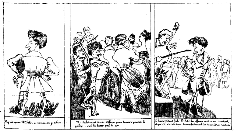 | Après quoi Mr. Jabot se remet en position. | Mr. Jabot croit devoir s'effacer pour laisser passer le galop; d'où la basse perd le son. | Le Bassier s'étant fâché, M. Jabot lui affirme qu'il est un insolent et que s'il n'était d'une classe subalterne il lui demanderait raison. |