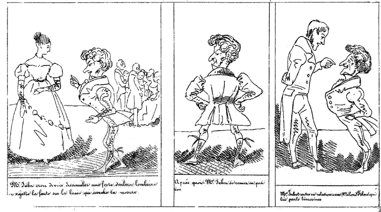 | Malheureusement Mr. Jabot termine son dernier entrechat sur le pied droit de Mme Josomby, sa danseuse, qui prend mal. | Mr. Josomby prend mal la chose. -- Il montre la porte à Mr. Jabot qui croit devoir lui demander satisfaction pour demain à 11 heures. |